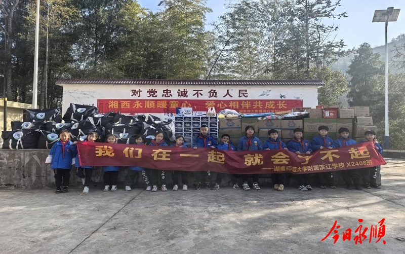 永顺融媒12月28日讯(通讯员 王霞平)12月27日,永顺县灵溪镇花园村、高峰村迎来了一群特殊的“小客人”。在省文旅厅驻高峰村工作队积极联络与牵线搭桥下,湖南师范大学附属滨江学校2408班的学生及家长一行,带着满满的爱心物资与真诚的问候,到乡村一线,开展了一场以“爱心图书进乡村,快乐运动伴成长”为主题的城乡手拉手公益共建活动。