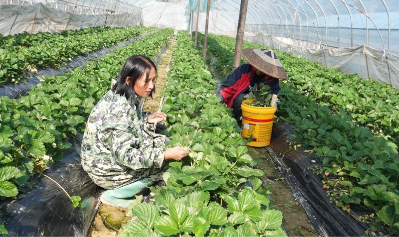 走进大棚内,只见翠绿的藤蔓间缀满颗颗深红饱满的草莓。合作社理事长张权和妻子正在仔细地为植株摘除老叶,确保每一株草莓都能充分接受光照。“冬日阳光宝贵,精细管理才能保证果品口感。”张权介绍道。去年12月,合作社精准的市场研判,成功引进“越王”品种,并凭借多年积累的技术经验开展自主育苗,从源头严控品质。今年9月定植的草莓,上市仅二十余天,便以其香甜软糯的出色口感,获得了县城水果店、社区团购等渠道的稳定订单。