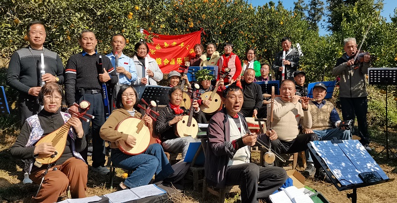 音乐助兴,干活不累。经过一个多小时的劳动,周铁山家柑橘园里的橘子一筐筐搬进了家里,只待销售。采摘结束后,学员们就在桔园里摆上乐器进行上课,排练《闹新春》曲目。课堂上老师认真进行指挥和讲解,学员们专注地操弄起自己携带的乐器,乐声与果香交融,悠扬旋律在橘园上空回荡,整个村寨成了欢乐的海洋。