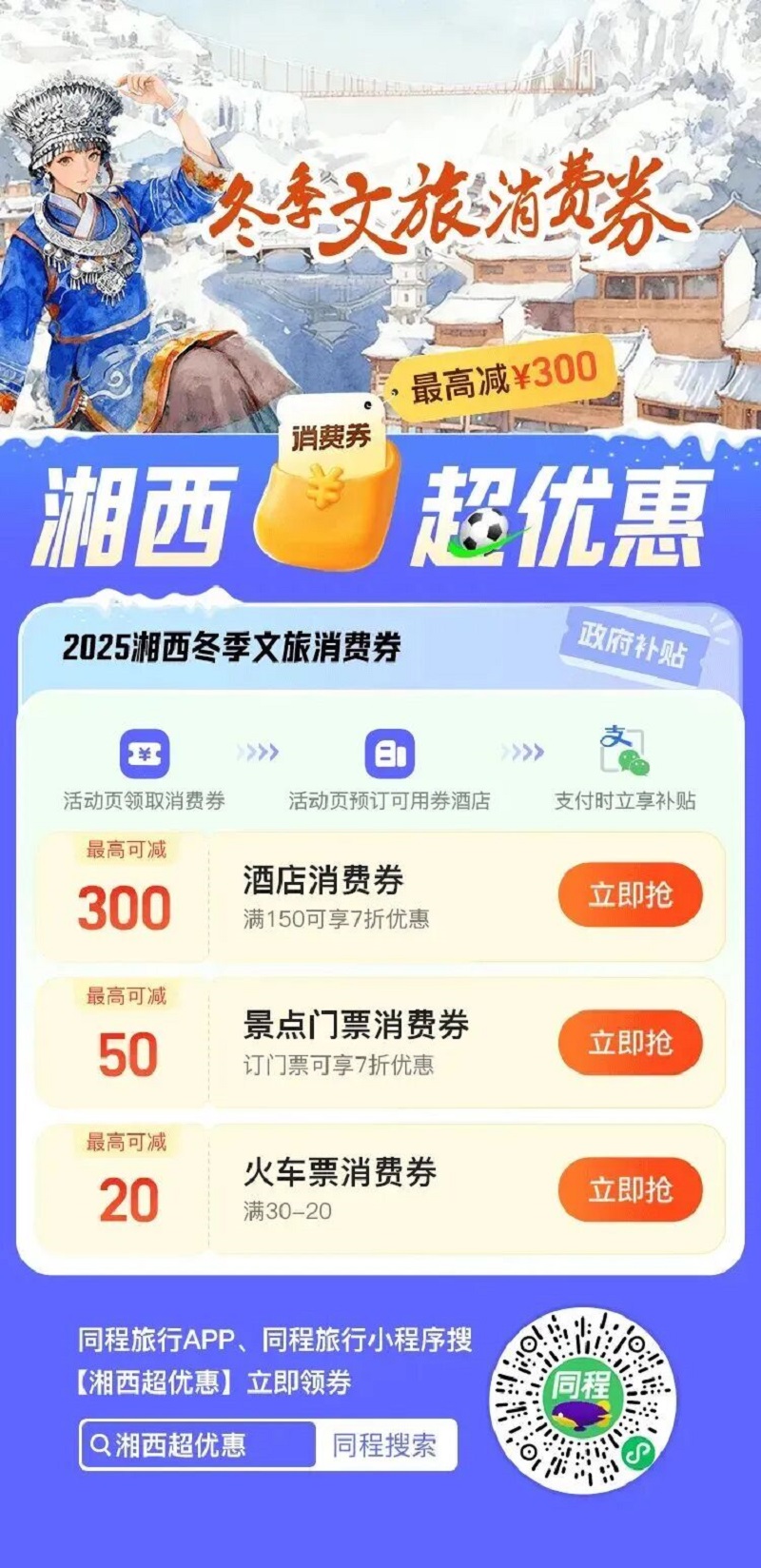 11月28日起,湘西土家族苗族自治州文化旅游广电局将联动同程旅行面向全国消费者发放“湘西超优惠”冬季文旅消费券!识别下方二维码可直达活动页面解锁更多福利详情!