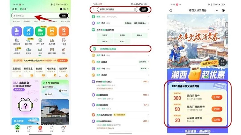 步骤1:活动期间,进入同程旅行APP/小程序,首页搜索框输入“湘西文旅消费券”、“湘西超优惠”、“湘西旅游”、“湘西”等关键词,进入“湘西超优惠”文旅消费券专题页,领取消费券红包。