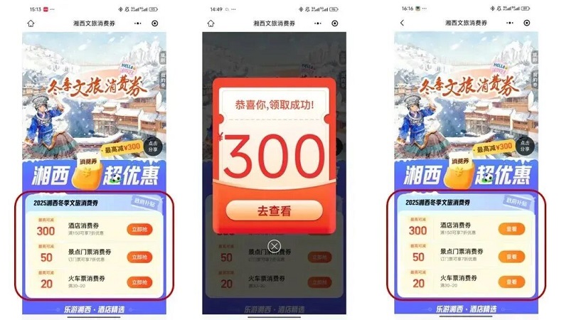 步骤2:湘西文旅消费券专题页内领取旅游酒店、景点、火车票消费券,点击“立即抢”,领取成功后将会出现弹屏,点击“去查看“可跳转至资源列表页。